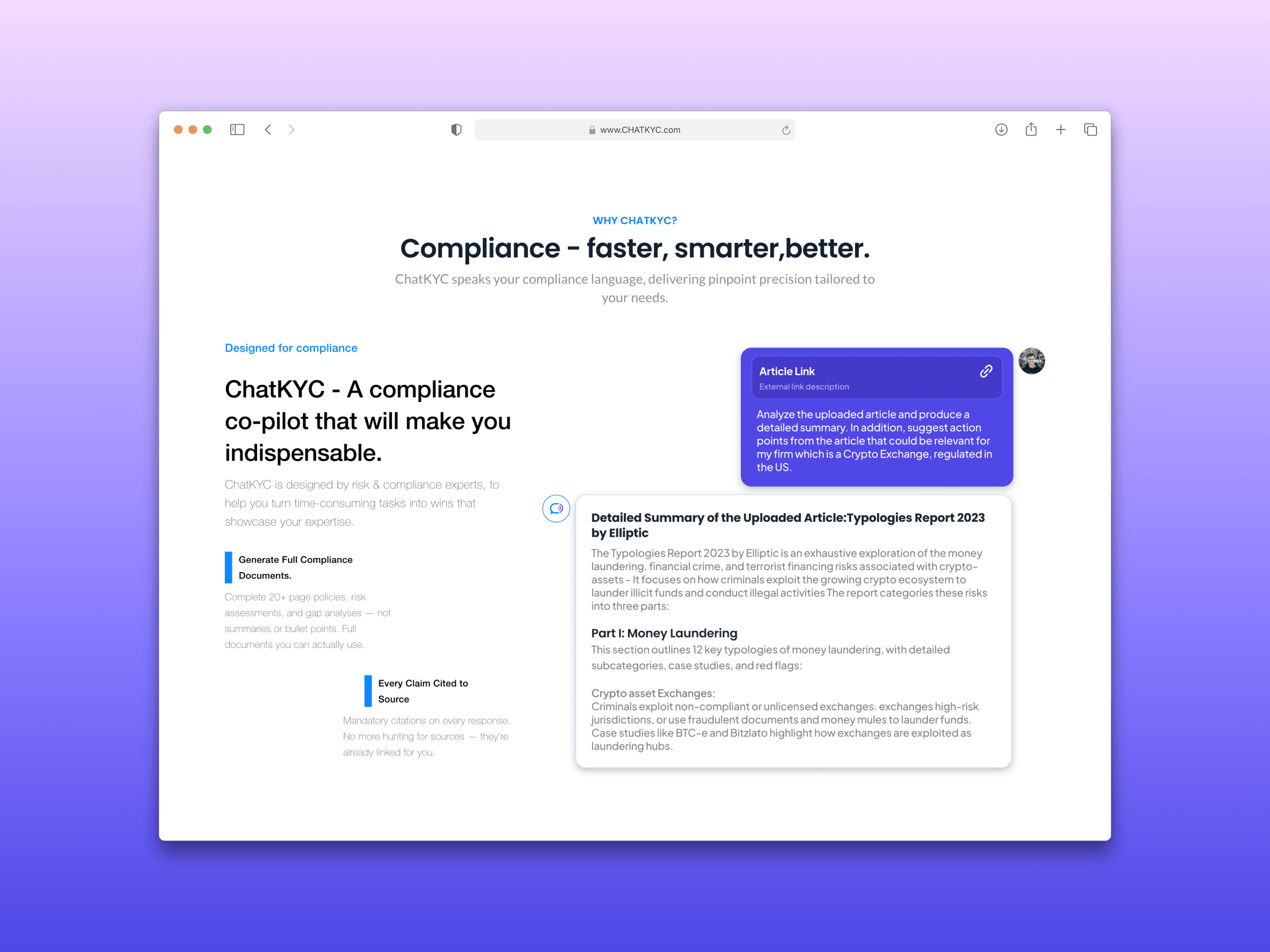 Compliance professionals spend most of their working week doing things that shouldn't take that long — drafting AML policies, building risk assessments, hunting through dense regulatory documents for a single cited clause. The brief was to build a product website for an AI platform designed to change that. ChatKYC generates full compliance documents, not summaries — complete policies, risk assessments, gap analyses, every claim cited back to source regulation in real time. I designed and built the marketing site in Framer, translating a technically complex product into something that felt immediately credible and accessible to the compliance professionals it was built for. The challenge was making AI feel trustworthy in an industry where trust is everything.